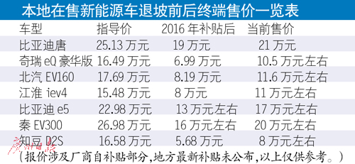 車天下記者近日走訪廣州本地市場看到,受到補貼減少的新政影響,新能源汽車出現(xiàn)價格上漲態(tài)勢。記者在北汽、奇瑞、比亞迪等新能源車銷售店里看見,一些新能源車車型已經(jīng)調(diào)價。一輛原本在去年補貼后售價為6.28萬元的純電動汽車,現(xiàn)在掛出來的售價為9.88萬元,上漲將近一半多;比亞迪旗下多款續(xù)航里程在300公里以上的新能源汽車,平均上調(diào)4.4萬元。