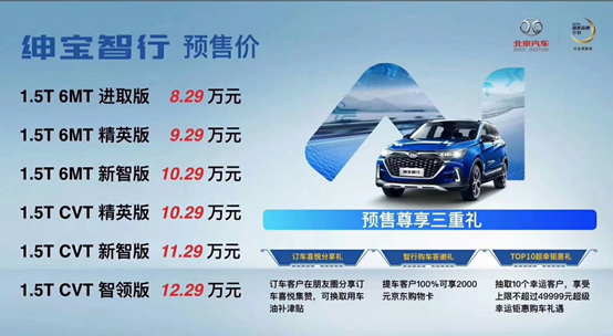 據(jù)悉,從8月31日成都車展開始,北京汽車已經(jīng)啟動了紳寶智行預(yù)售活動,并推出訂車喜悅分享禮、智行購車答謝禮、TOP10超幸鉅惠禮三重大禮,最高能省49999元。