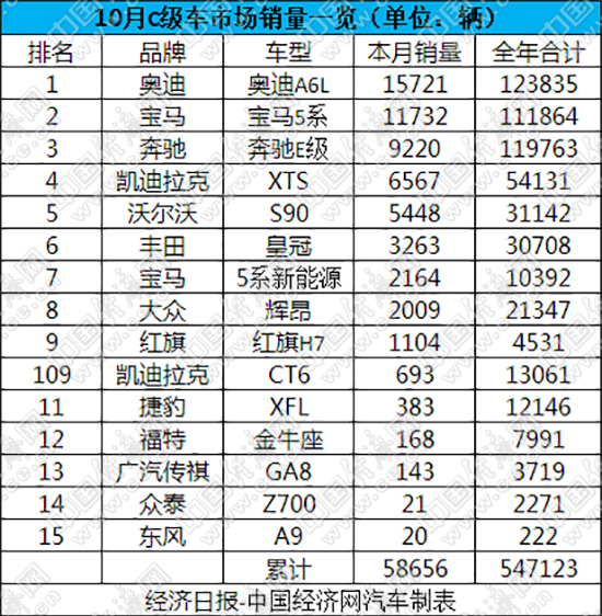 統(tǒng)治C級車市場近30年的奧迪A6L,即便處在產(chǎn)品生命期末端,依舊不減“老大”的霸氣。數(shù)據(jù)顯示,A6L在10月份的銷量達(dá)15721輛,勇奪單月銷量冠軍;前10個月的累計(jì)銷量為123835輛,趕超奔馳E級,重新收獲C級車市場的銷量冠軍。