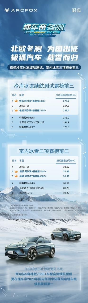 值得一提的是,就在剛剛結(jié)束的2023懂車帝冬測(cè)中,極狐汽車憑借優(yōu)異的表現(xiàn)驚艷國(guó)內(nèi)及海外市場(chǎng)。其中,參賽車型阿爾法S森林版735E+,以368.8的實(shí)測(cè)續(xù)航里程在國(guó)內(nèi)冬測(cè)中取得純電轎車組續(xù)航里程第一名的好成績(jī)。而阿爾法T森林版688E+、阿爾法S森林版735E+在北歐冬測(cè)中,更是以驚人的表現(xiàn),實(shí)力霸榜冷庫(kù)冰凍續(xù)航測(cè)試、室內(nèi)冰雪三項(xiàng)榜單前三,向世界展現(xiàn)了中國(guó)新能源汽車的卓越品質(zhì)。