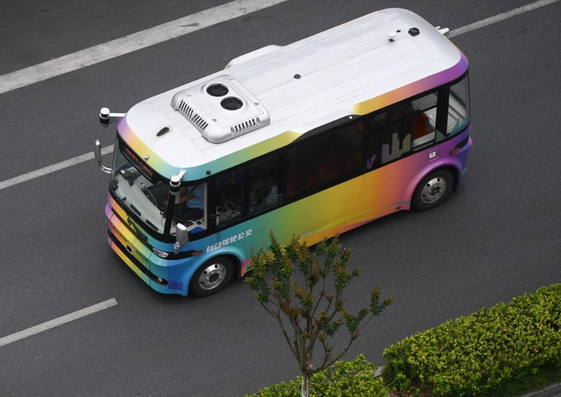 5月22日,自動駕駛接駁示范線巴士行駛在杭州市余杭區(qū)未來科技城的道路上。新華社記者 黃宗治 攝