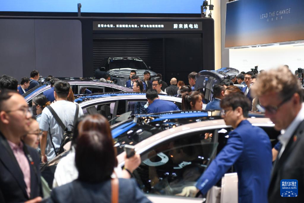 在2024北京車展上,參觀者在蔚來汽車展臺(tái)參觀電動(dòng)汽車換電站演示。新華社記者鞠煥宗攝