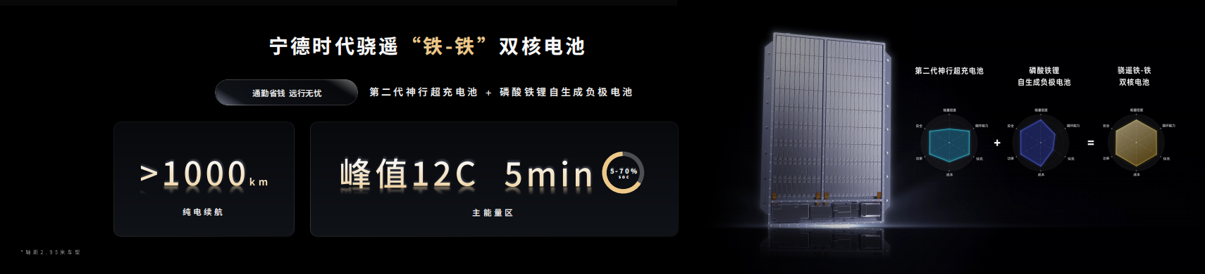 鐵-鐵雙核電池:第二代神行超充電池+磷酸鐵鋰自生成負(fù)極電池,在軸距接近3米的車(chē)型上可輕松實(shí)現(xiàn)千公里純電續(xù)航,同時(shí)讓每公里通勤成本低至1毛錢(qián)。