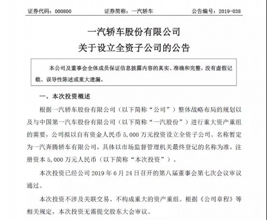 6月25日,一汽轎車正式發(fā)布了《一汽轎車股份有限公司關(guān)于設(shè)立全資子公司的公告》,提出“擬以自有資金人民幣5000萬元投資設(shè)立全資子公司”,名稱暫定為“一汽奔騰轎車有限公司”。按照此前發(fā)布的《一汽轎車股份有限公司重大資產(chǎn)置換及發(fā)行股份和可轉(zhuǎn)換債券、支付現(xiàn)金購買資產(chǎn)并募集配套資金暨關(guān)聯(lián)交易預(yù)案》,此次成立的“一汽奔騰轎車有限公司”在接受了一汽轎車的“置出資產(chǎn)”后,其100%股權(quán)將過戶至一汽股份。至此,一汽轎車的主營業(yè)務(wù)將從“乘用車的開發(fā)、制造和銷售”徹底變更為“商用車的開發(fā)、制造和銷售”,與一汽夏利間的同業(yè)競爭問題,即將徹底得到解決。