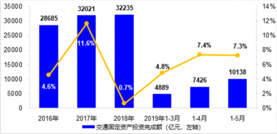 1-5月,交通固定資產(chǎn)投資完成10138億元,同比增長(zhǎng)7.3%,較去年全年加快6.6個(gè)百分點(diǎn)。公路水路完成投資7537億元,同比增長(zhǎng)4.8%,其中公路、內(nèi)河、沿海分別完成投資7115億元、215億元和196億元,同比分別增長(zhǎng)4.5%、14.7%和8.1%。