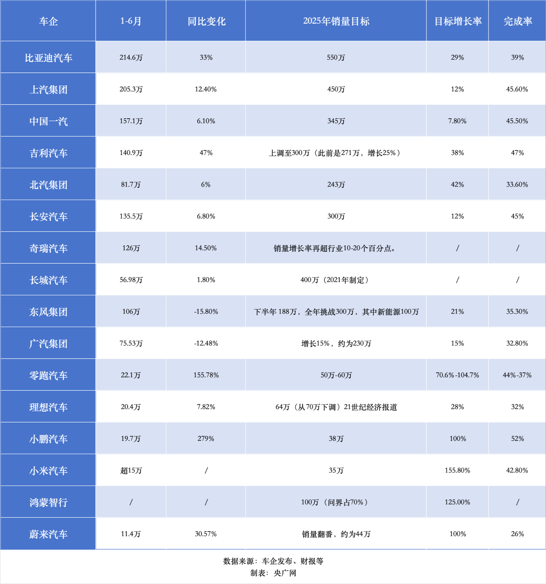 央廣網(wǎng)統(tǒng)計(jì)的各大汽車集團(tuán)、車企公布的銷量數(shù)據(jù),目前,蔚來汽車的目標(biāo)完成率低于30%,比亞迪汽車、北汽集團(tuán)、東風(fēng)集團(tuán)、廣汽集團(tuán)、理想汽車5家車企的目標(biāo)完成率在30%-40%之間,上汽集團(tuán)、中國一汽、吉利集團(tuán)、長(zhǎng)安汽車、零跑汽車、小鵬汽車、小米汽車7家車企的完成率超過40%。此外,奇瑞集團(tuán)、長(zhǎng)城汽車、鴻蒙智行等因數(shù)據(jù)不完善此次不計(jì)入統(tǒng)計(jì)。