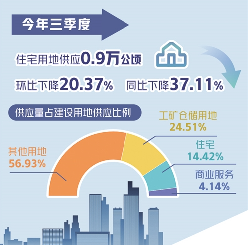 該報告顯示,三季度全國105個主要監(jiān)測城市建設(shè)用地供應(yīng)面積6.24萬公頃,環(huán)比增加7.34%,同比下降17.28%。除住宅用地外,商業(yè)服務(wù)用地供應(yīng)0.26萬公頃,環(huán)比下降18.34%,同比下降39.18%;工礦倉儲用地供應(yīng)1.53萬公頃,環(huán)比增加4.57%,同比下降21.53%;交通、水利基礎(chǔ)設(shè)施等其他用地供應(yīng)3.55萬公頃,環(huán)比增加22.31%,同比下降4.98%。