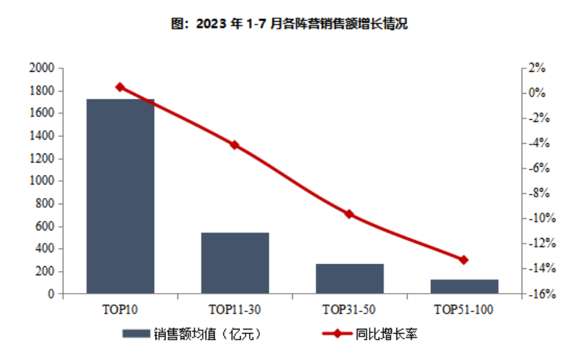 2023年1-7月,百億以上陣營(yíng)企業(yè)數(shù)量減少。具體來(lái)看,千億以上陣營(yíng)10家,與去年同期持平,銷售額均值1725.5億元。第二陣營(yíng)(500-1000億)企業(yè)7家,較去年同期減少4家,銷售額均值785.8億元。第三陣營(yíng)(300-500億)企業(yè)20家,較去年同期增加1家,銷售額均值383.5億元。第四陣營(yíng)(100-300億)企業(yè)為48家,較去年同期減少3家,銷售額均值171.0億元。