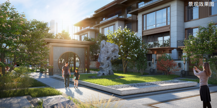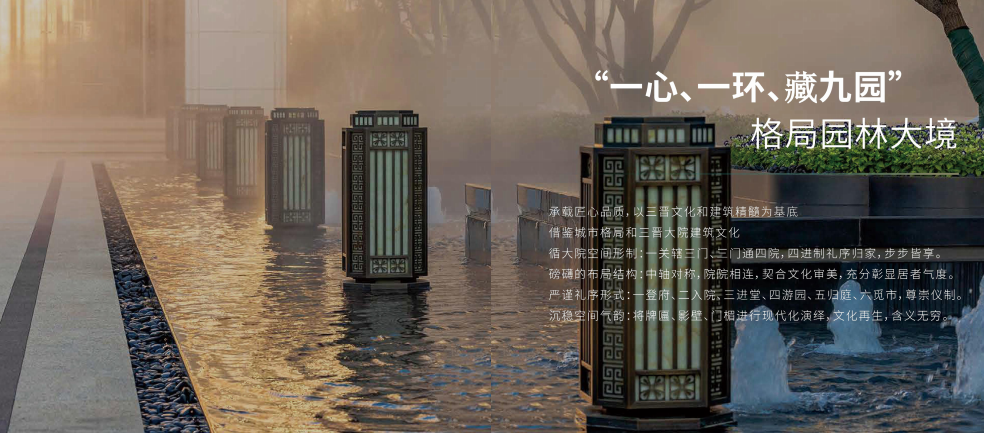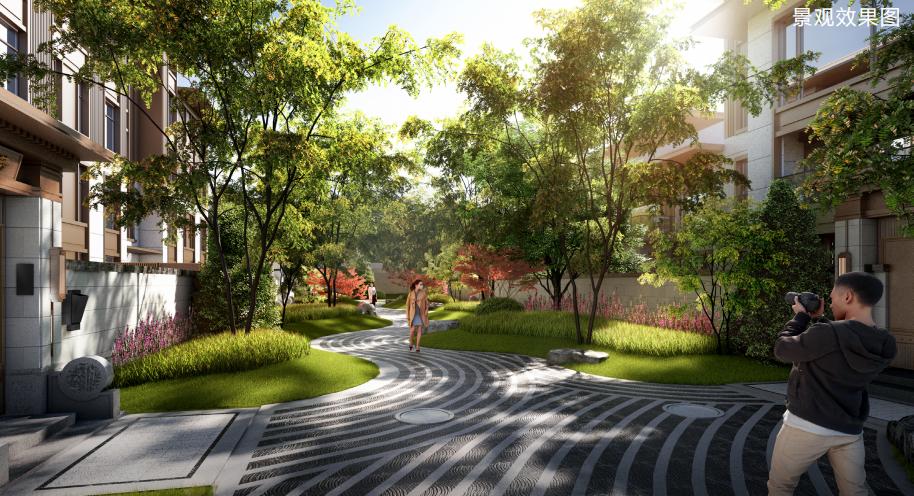 項(xiàng)目整體景觀設(shè)計(jì)以山林水源,禪意大宅為主線(xiàn),將江南園林與皇家園林相結(jié)合,形成前府后院的園林形態(tài),景觀采用四級(jí)九景,四重栽植的造園手法,點(diǎn)綴了九個(gè)院落,四十個(gè)景點(diǎn)。園林鋪裝精致而具有設(shè)計(jì)感,在細(xì)節(jié)中加入特有的重視吉祥紋樣,更突出了新中式園林的設(shè)計(jì)風(fēng)格。