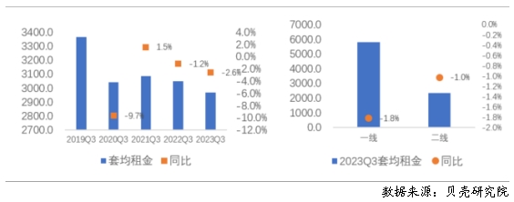 三季度,一線城市租金成交價同比跌幅高于二線城市,一線城市除北京微漲外,上海、廣州、深圳均同比下跌