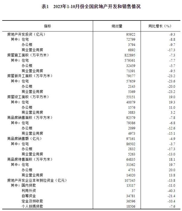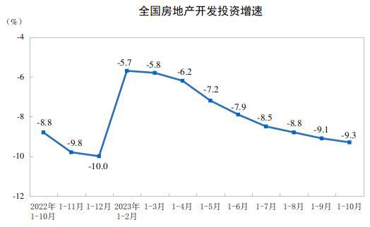 1—10月份,全國房地產(chǎn)開發(fā)投資95922億元,同比下降9.3%(按可比口徑計算,詳見附注6);其中,住宅投資72799億元,下降8.8%。