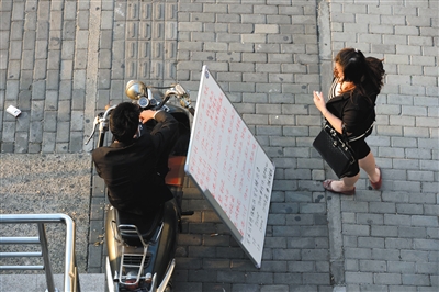 2013年10月14日,一位市民在看房產(chǎn)中介放置于上海自由貿(mào)易試驗(yàn)區(qū)二號門附近的房源信息。圖/視覺中國