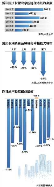 北京在9月30日出臺的政策影響了市場熱度,市場進入了急速冷凍階段。中原地產(chǎn)研究中心統(tǒng)計數(shù)據(jù)顯示,2016年國慶長假期間,7天北京新建住宅簽約216套,二手房住宅簽約209套。合計簽約425套。而2015年國慶7天簽約為543套。從簽約數(shù)據(jù)看,北京新建住宅成交量為2011年來6年最低點。對此,中原地產(chǎn)首席分析師張大偉分析認(rèn)為,預(yù)計北京房價將快速降溫,四季度漲幅將明顯放緩,在自住房大量供應(yīng)后,部分區(qū)域的價格很可能出現(xiàn)調(diào)整。