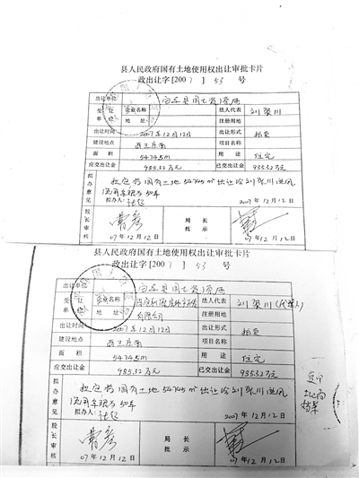 土地檔案中《國有土地使用權(quán)出讓審批卡片》與劉聚川提供的原件復(fù)印件對比。記者 朱旭東 攝