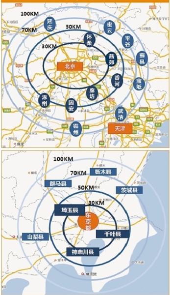 京津冀、東京都市圈輻射范圍對(duì)比