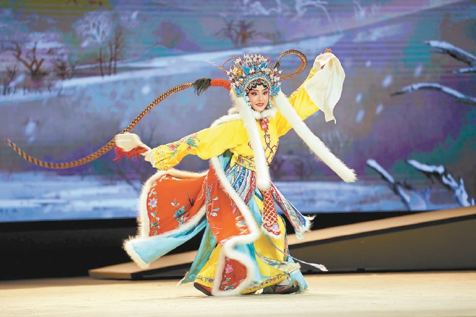 雖然以傳統(tǒng)戲?yàn)橹鳎强梢钥闯鰜?lái)這部戲力圖呈現(xiàn)四大美人與眾不同的一面。風(fēng)雷京劇團(tuán)團(tuán)長(zhǎng)松巖表示,他們希望不再是簡(jiǎn)單地平面化呈現(xiàn)四大美人的外貌之美,而是要彰顯她們的精神之美,“從我個(gè)人情感來(lái)講,王昭君不只是一個(gè)簡(jiǎn)單的美人,更是一個(gè)偉大的使者。”在舞臺(tái)呈現(xiàn)上,雖然有儀仗隊(duì)前來(lái)送行,但儀仗隊(duì)待在角落,王昭君則獨(dú)自站在風(fēng)雪中,“她心里凄涼,但又懷著為祖國(guó)、為和平奉獻(xiàn)力量的熱情?!彼蓭r說(shuō),他希望通過(guò)京劇表演和音樂(lè)、多媒體手段的結(jié)合,讓觀眾不僅能夠欣賞京劇的唱念做打,還能感受到傳統(tǒng)京劇舞臺(tái)上感受不到的真情實(shí)景的氛圍。