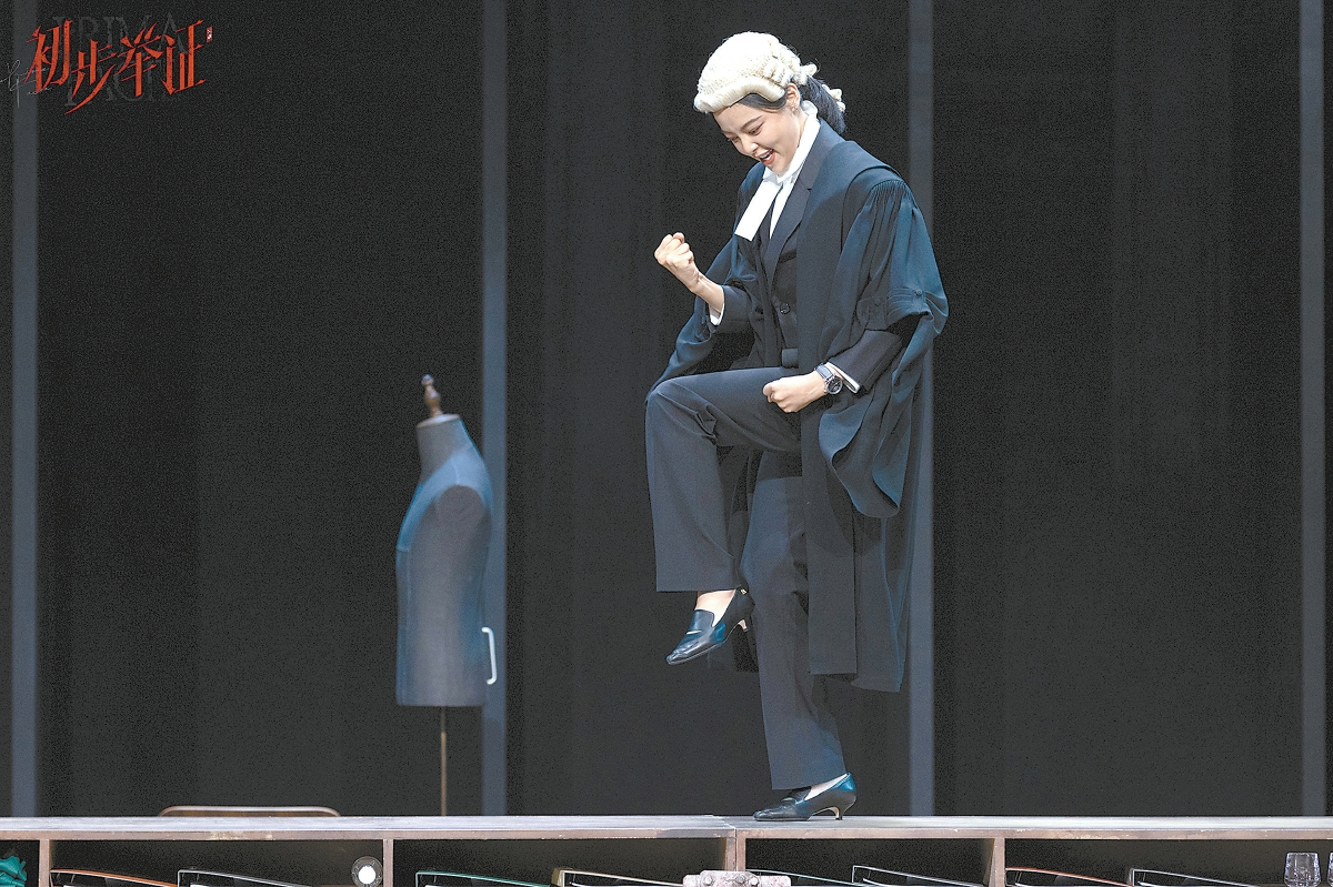 舞臺極為對稱。最醒目的,是兩側(cè)微微斜切向后景的賽馬欄。如果從上方俯視,賽馬欄將舞臺空間變成了一個等邊梯形,中央橫放著長長的組合式開架矮桌柜。這是由蘇西·米勒編劇、周可導(dǎo)演的獨(dú)角戲《初步舉證》中文版的現(xiàn)場。從大空間布局上看,中文版與2022年4月英國NTlive版有一定相似性。但舞臺布景的差異,還是顯示出導(dǎo)演不同的側(cè)重點(diǎn)。NTlive版以三面巨大的、裝滿卷宗的書柜構(gòu)成了半包圍式舞臺結(jié)構(gòu),舞臺中央是兩張大辦公桌。這一偏于寫實(shí)的布景突出了主角的律師身份,既富專業(yè)性,又有無形的壓迫感。中文版的賽馬欄則暗示庭辯仿佛賽馬,突出了律師爭當(dāng)“第一名”的渴望。從觀眾席望去,對稱的舞臺呈現(xiàn)出一種均衡和穩(wěn)定。演出開始后,伴隨有轉(zhuǎn)臺功能的矮桌柜的一次次旋轉(zhuǎn),主人公以她失衡的人生告訴觀眾:有些事情必須改變。