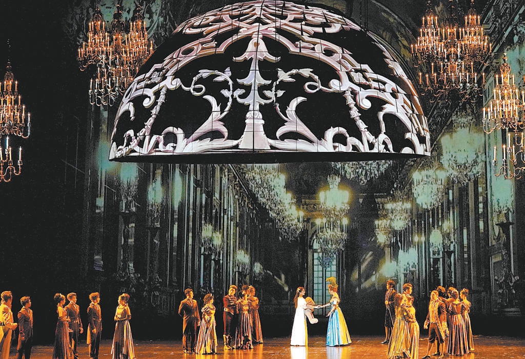 與壯闊宏大的作品立意相匹配的,是當?shù)闷鹑A美二字的舞臺呈現(xiàn)。璀璨的吊燈、長長的樓梯等鮮明意象不斷出現(xiàn),簡潔的布景與流動的影像虛實交織,把輝煌的宮廷、幽靜的鄉(xiāng)村、無垠的星空等場景營造得深邃動人。其中,由多塊LED屏拼成的圓弧最引人注目,在舞美設(shè)計維亞切斯拉夫·奧庫涅夫的解讀中,和平的寧靜短暫降臨時,圓弧可以隨影像變幻為宮殿穹頂、簡潔的花園涼亭,為生活遮風擋雨;戰(zhàn)爭襲來,刺目的紅光從破裂崩碎的圓弧中迸濺而出,恰如滿目瘡痍、生靈涂炭的現(xiàn)實。最終,幾瓣圓弧拼成碧水青山的“地球”,呼應原著小說標題中的俄語單詞“Mip”,即“世界”,將作品的意境再次推上新的高點。