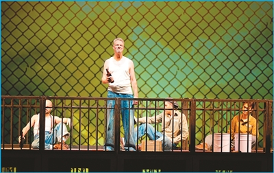 演出開場,鐵絲網(wǎng)幕在昏暗的冷光里升起,囚犯們在鐵籠里形如困獸。這一場景勾勒出肖申克監(jiān)獄的陰森可怖,壓迫感令人屏息。遇到暴力沖突時,血紅色燈光瞬間籠罩舞臺,渲染出緊張氛圍。每逢監(jiān)獄操場上的閑談時刻,暖黃色燈光灑下,幕布上的高墻外飄著幾行疏云,透出難得的安適。