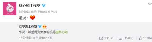 中新網(wǎng)5月20日電今日,霍建華工作室官方微博發(fā)布一條消息,稱“華說:希望得到大家的祝福?!辈亓肆中娜纭kS后,林心如工作室官方微博轉(zhuǎn)發(fā)微博,發(fā)表紅心默認。