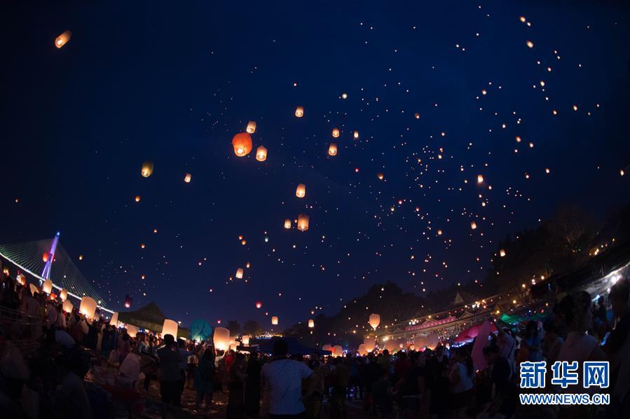 當(dāng)日,各族群眾和國內(nèi)外游客在云南西雙版納景洪市瀾滄江畔放飛孔明燈,喜迎傣歷1378年新年。