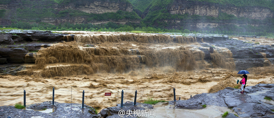 受上游強降雨和水庫放水影響,最近幾天,黃河壺口瀑布迎來伏汛,最大水流量達到每秒2600立方米左右,濁流滾滾奔騰而下,氣勢磅礴?。ㄑ胍曈浾呃钪?文豪)