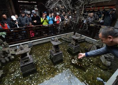 中午時分,記者又一次仔細觀察了水池,在游人拋投硬幣時,確實有一兩條金色的觀賞魚在石縫處游動著。在木制欄桿四周,正貼著“禁止倚靠欄桿”、“禁止投幣”等字樣?!按汗?jié)游客爆滿,水池是從寬巷子到窄巷子的必經(jīng)之道,加上很多人在拋硬幣,頓時人滿為患。我們只好打印了幾張?zhí)嵝褟堎N起來?!鞭k公室工作人員還表示,“等春節(jié)游客潮稍微退卻,天氣回暖,我們就要派人下水打撈這些硬幣,用于景點建設?!?/p>