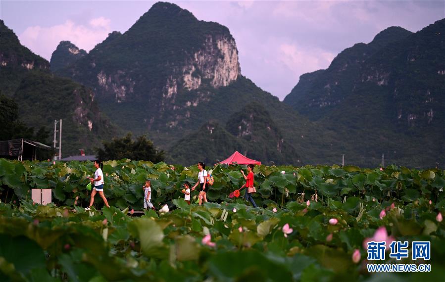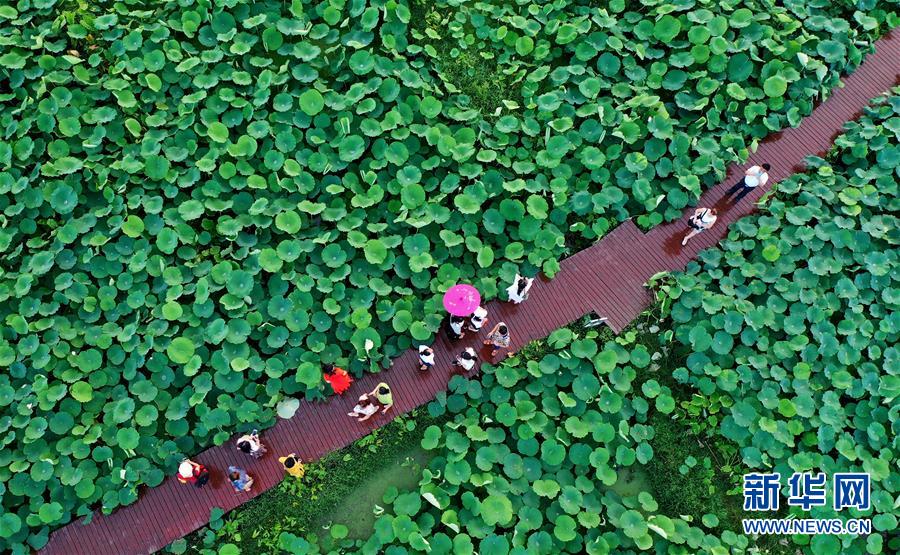 6月28日,游客在廣西柳州市柳江區(qū)百朋鎮(zhèn)萬畝荷塘里游玩。新華社發(fā)(黎寒池 攝)