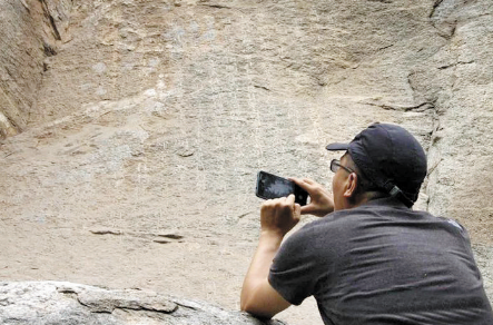 離開龍泉寺遺址,四人順著石階退下廟宇高臺,在王老師的引導下,尋找那片記憶中的摩崖石刻。終于在高臺東側約40米處的山體上,發(fā)現(xiàn)高懸兩米的摩崖石刻。一片巖壁上刻有國子監(jiān)生行書《龍泉寺記》。巖壁上鑿刻有一方石窟,石窟內供奉“龍王”,石窟外懸掛有當?shù)卮迕駚泶饲笥瓿晒Φ腻\旗。大家出于好奇,搭人梯攀巖,仔細辨認石刻字面,想看個究竟。整個石碑高不達3米,寬約2米,整體呈含胸內斂之勢,可蔽風雨侵蝕。卻因時年久遠,底部泥土沉淀遮擋,部分文字不可通讀。粗略判斷全文10列,每列32字,單字大小7厘米,共約300余字。