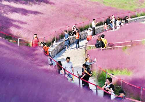金秋時(shí)節(jié),福建省福州市牛崗山公園和鶴林生態(tài)公園里的粉黛亂子草進(jìn)入觀賞季,成片的“粉色海洋”如夢(mèng)幻花海,吸引游客和攝影愛(ài)好者前來(lái)觀賞拍攝。圖為10月11日,游客在福州牛崗山公園游玩。 新華社記者 魏培全 攝