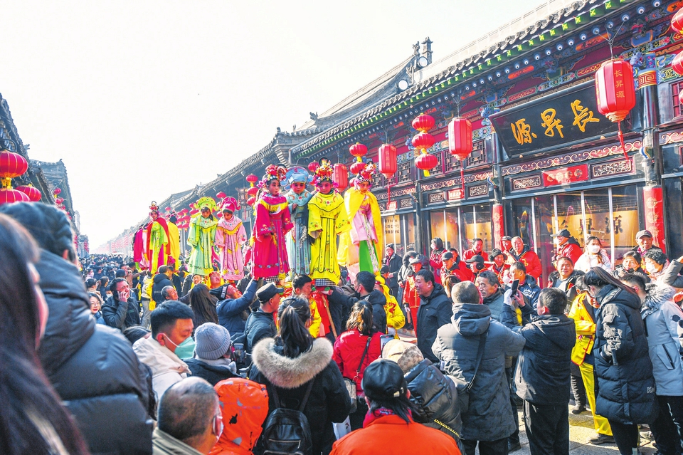 1月31日,游客在平遙古城觀看民俗社火表演。元宵節(jié)臨近,平遙古城內(nèi)舉行具有當(dāng)?shù)靥厣拿袼渍寡莼顒?dòng),熱熱鬧鬧迎元宵。