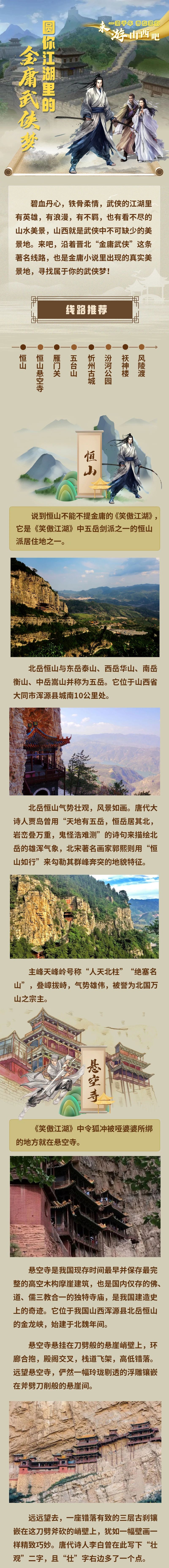 2023山西國(guó)風(fēng)文化月已經(jīng)啟動(dòng),啟動(dòng)儀式上發(fā)布的“金庸武俠線路”“詩(shī)詞名篇線路”“國(guó)家寶藏線路”三條國(guó)風(fēng)文化線路備受關(guān)注??次鋫b、讀詩(shī)詞、賞國(guó)寶,國(guó)風(fēng)山西到底怎么玩兒?三張長(zhǎng)圖帶你走一遍!