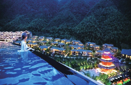 徜徉泳池,可觀落日余暉、滿天星辰,一邊是古風(fēng)古韻的漢唐建筑,一邊是綠意正濃的山林竹間;一半是封存塵世的自然風(fēng)景,一半是觸手可及的浪漫風(fēng)情。俯瞰葛仙村,盡享古韻之美。傍晚,落日余暉均勻曬在水面上,散為金光,而晚霞,也幻成異樣的色彩,一層層的光和色,相互交融著,“落霞與孤鶩齊飛,秋水共長(zhǎng)天一色”的意境就是如此吧。夜里輕柔的晚風(fēng),拂過泳池,水波粼粼,被周邊的燈光映襯得就像無(wú)數(shù)的水晶鋪設(shè)在水面上,星空與池底交相呼應(yīng),帶來(lái)無(wú)盡的浪漫氣息。