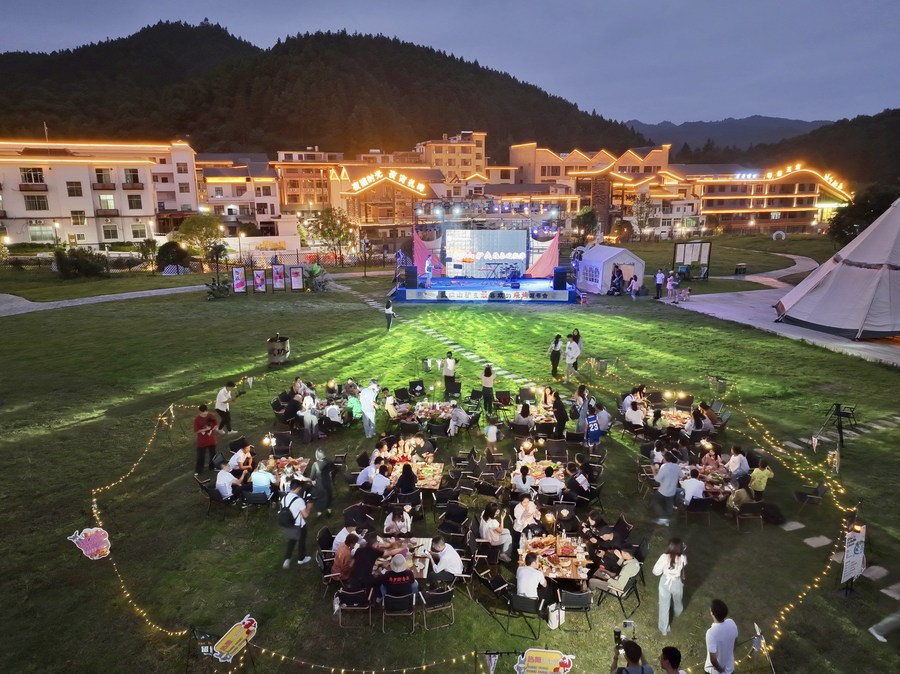 新華社南昌10月6日電(記者朱雨諾、程迪)夜幕之下,江西萍鄉(xiāng)市武功山景區(qū)的驢友帳篷大本營(yíng)內(nèi)熱鬧非凡。喜愛音樂的游客在演出現(xiàn)場(chǎng)跟著歌曲旋律搖擺,也有不少游客三五成群,坐在天幕下邊看電影邊吃燒烤,享受著假期悠閑時(shí)光。