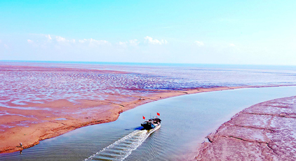 2023年10月10日,航拍山東省東營(yíng)市東營(yíng)紅灘濕地旅游區(qū)景色。東營(yíng)市是全球首批“國(guó)際濕地城市”,擁有我國(guó)暖溫帶保存最廣闊、最完善、最年輕的濕地生態(tài)系統(tǒng),入秋以來(lái)晝夜溫差加大,生長(zhǎng)在灘涂上的大片鹽生植物開始由綠轉(zhuǎn)紅,遠(yuǎn)遠(yuǎn)望去火紅一片,宛若一塊巨大的“紅地毯”。劉智峰攝(人民圖片網(wǎng))