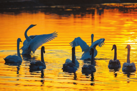 夕陽(yáng)下運(yùn)城市千年鹽湖內(nèi)的天鵝。