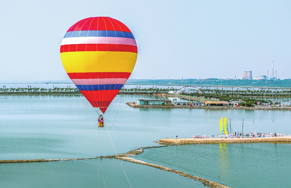 9月7日,游客在運城鹽湖景區(qū)乘坐熱氣球觀賞鹽湖美景。近日,該景區(qū)推出“乘坐熱氣球 觀七彩鹽湖”體驗游覽項目,讓游客感受別樣的鹽湖風(fēng)景。