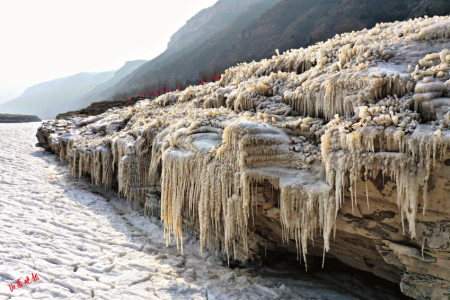 黃河壺口瀑布,往日奔騰咆哮的黃河水,像是被大自然施了魔法一般,飛濺的浪花和彌天水霧在兩岸巖石和護欄上迅速凝結,形成了層層疊疊、形狀各異的冰掛。巨大的冰柱從河岸懸垂而下,宛如一座巨大的琉璃宮殿,又似一道天然的冰簾。河水拍打著冰層,發(fā)出震耳欲聾的咆哮聲,與飛瀑上空的彩虹交相輝映,展現(xiàn)出大自然的磅礴氣勢與壯美。