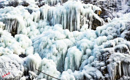 五老峰景區(qū)錦繡谷,工作人員借助天然溪流形成的冰掛加以人工造冰造型,按照生態(tài)環(huán)保和藝術創(chuàng)意要求,打造出長約1公里、單體高3米至10米的彩色冰掛,極具視覺沖擊力。一條條冰掛或垂于崖壁,或懸于樹枝,晶瑩剔透,壯觀雄渾。滿目的玉樹瓊花、銀峰玉柱形成一幅霧凇冰掛奇景,讓人仿佛置身于童話世界。