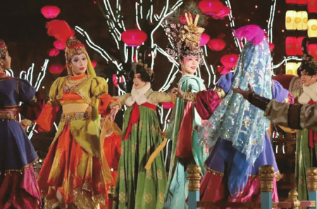 有才華的游客可以在《盛唐密盒》處舉手示意,與演員互動;喜歡李白的游客可以在《詩歌藝術》處與李白 對詩;《花車 斗彩》處西域胡姬與大唐美女現(xiàn)場斗舞,彰顯盛唐時期絲路文化和盛唐文化的和諧交融,仿佛到了古裝電視劇中的上元節(jié);《貞觀之治》處則可感受李世民時期萬國來朝賀的盛世景象;一路有行為藝術,《武士雕刻》《奮斗在路上》《畫中人》《戲演壁畫》等讓人目不暇接,一路走走停停,到達最南端的開元廣場,就可以看一場大唐不夜城場地最大、演員最多、時間最長的表演《再回長安》,感受大詩人白居易回長安的盛大氛圍;開元廣場東側(cè)不倒翁小姐姐表演,周圍也圍著很多游客,不遠萬里前來一睹小姐姐美麗的身姿。
