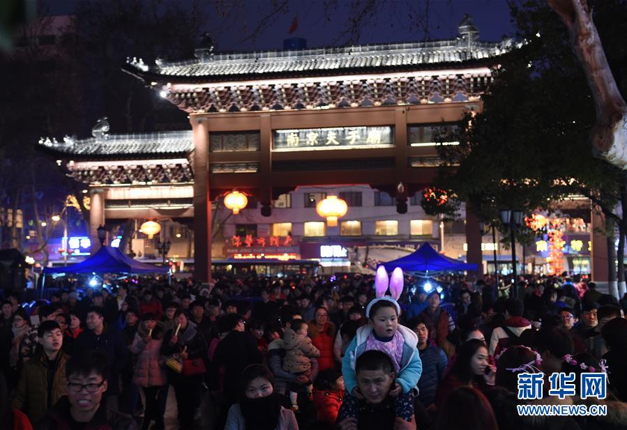2月22日晚,游人在夫子廟景區(qū)觀燈游玩。當晚,在江蘇南京夫子廟秦淮風(fēng)光帶舉辦的秦淮燈會彩燈齊放,人們前來觀燈鬧元宵。 新華社記者孫參攝