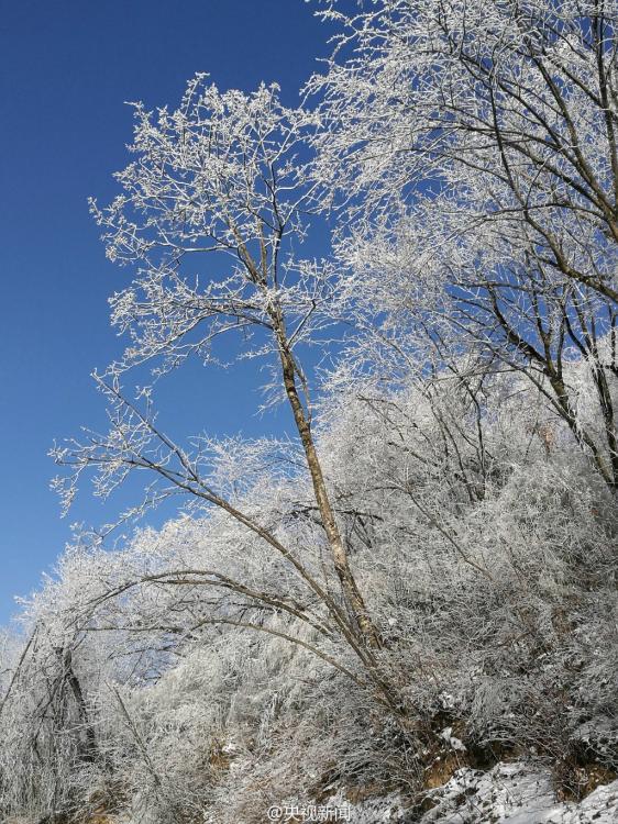 受較強(qiáng)冷空氣影響,秦嶺腹地涼風(fēng)埡山頂,出現(xiàn)大面積霧凇景觀。玉樹瓊枝,晶瑩剔透,讓涼風(fēng)埡山頂變得像童話世界一般,美不勝收。 央視記者王志杰 圖片來源:央視新聞微博