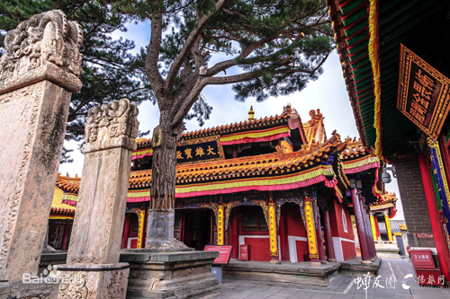 全寺占地四十五畝,順山就勢(shì)而筑殿宇,布局嚴(yán)謹(jǐn)。寺前有石階一百零八級(jí)。山門(mén)內(nèi)有天王殿、鐘鼓樓、大雄寶殿等建筑。各殿均用三彩琉璃瓦覆蓋。又,寺內(nèi)有康熙御碑,方座螭首,矗立在前院;乾隆御碑在東禪院碑亭內(nèi),以方形巨石雕成,高六公尺,每面寬一公尺,上刻漢、滿(mǎn)、蒙、藏四種文字。