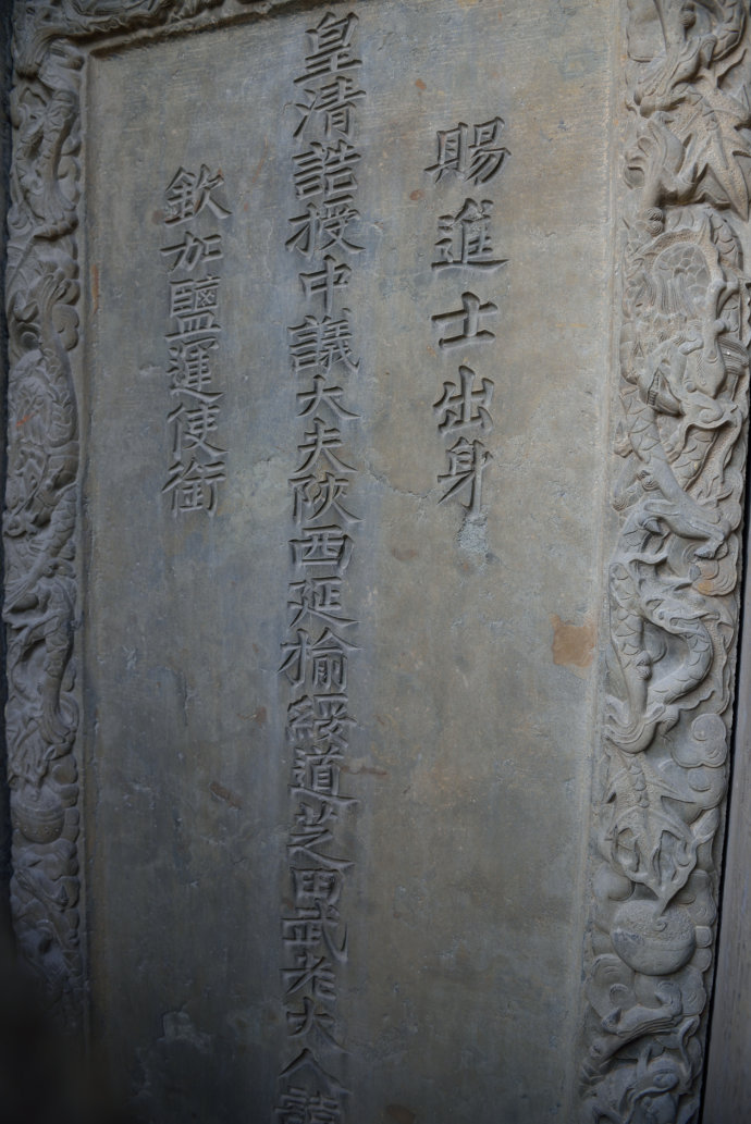 配坊實際上是一座功名石牌坊,上面刊載著武訪疇一家四代人的姓名及朝廷贈封的官爵,咸豐六年(1856)由武訪疇修建。這座石雕牌坊與其它牌坊最大的區(qū)別就是沒有題刻坊名,因此只能稱之為配坊。坐北向南,為四柱三間三樓單檐歇山頂結(jié)構(gòu),牌樓高8米,寬12米,坊體坐落在近1米高的長方形臺基上,立柱仍然采用夾柱石固定。坊頂覆蓋青瓦,正脊飾石雕貔貅裝飾,飛檐翹角,明樓檐下為“圣旨”牌,當心間設兩層小字板,第一層題刻:“贈資政大夫曾祖父廷桂,贈夫人曾祖母李氏;誥贈資政大夫祖父秉壁,誥贈夫人祖母吳氏;誥贈資政大夫父烈,誥封夫人母朱氏。陜西分巡延榆綏兵備道、加四級武訪疇謹建?!钡诙宇}刻“大清咸豐六年歲次丙辰仲夏上院榖旦”。武訪疇借建坊要弘揚祖輩陰德,而祖輩的姓氏大名又不能題刻在母親的節(jié)孝牌坊上,所以,他必須另建一坊才能完整地表達心愿。實際上,這就是建造配坊的真正目的。也正因此在配坊題刻“龍光錫寵”、“鳳詔褒榮”、“克成先志”、“重裕后昆”等。