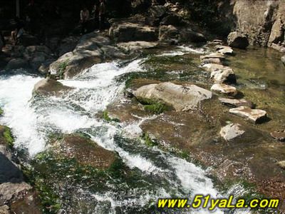 過了洗臉盆便是水簾洞。一股兩米寬的泉水從北峽溝的洞中涌出,緩流四五十米后順山崖直壁而下,一派“飛流直下三千尺”的磅礴氣勢。其后一深洞,嘩嘩瀑布落就半崖伸出的青石板上,打著飛快的漩渦卷人洞內(nèi),而后又從洞底端漏口處噴出,驚濤駭浪之聲震山蕩谷。泉水正是莽河之源。這個洞叫“出水洞”,一年四季泉水奔流不息。泉水流經(jīng)之處,有一個懸崖,形成瀑布,這就是莽河著名的風(fēng)景區(qū)“水簾洞”,因?yàn)閼已轮虚g有個洞,像是在瀑布中間有個巨莽的腦袋,蟒口大張,吸水噴霧,戲耍流泉。另有一塊巨石,像是一只烏龜從甲殼底下探出了頭,似乎在祈求幫助。嘩嘩瀑布落就半崖伸出的青石板上,打著飛快的漩渦卷人洞內(nèi),而后又從洞底端漏口處噴出,驚濤駭浪之聲震山蕩谷。