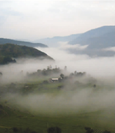 炊煙裊裊的村莊,偷偷地從薄霧里露出惺忪的臉來,時(shí)隱時(shí)現(xiàn),猶如傳說中的蓬萊仙島。一個(gè)個(gè)白族村莊沉浸在美輪美奐的仙境之中,整個(gè)峽谷布滿著一幅幅精美絕倫的淡墨山水畫。可惜的是村中的人們還未品嘗出做神仙的滋味,霧海就隨著江面吹來的西風(fēng)越升越高,不一會(huì)兒,就向羅平山頂飄襲而來。我們幾個(gè)觀霧者迅即被淹沒在濃濃的云山霧海中,成了騰云駕霧的神仙了。遺憾的是我們還未過足神仙癮,那些飄蕩在山頂?shù)脑旗F就被熱烈而耀眼的太陽光收回去了,讓我們不得不回到人間,仍去做原來的凡夫俗子。