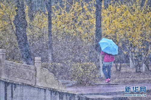 4月3日,市民在延慶區(qū)一個公園中賞雪。當(dāng)日,華北中部地區(qū)氣溫驟降,位于燕山山脈腳下的北京市延慶區(qū)降下一場春雪。 新華社記者 李欣 攝