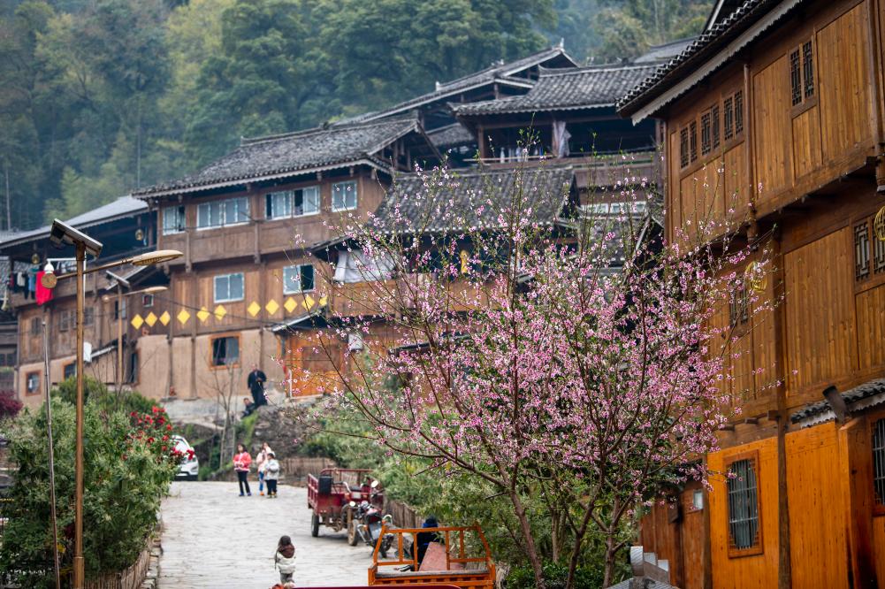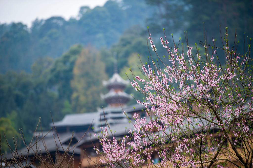 ?? 2024年3月10日,貴州省從江縣高增鄉(xiāng)占里侗寨內(nèi)盛開(kāi)的桃花與鼓樓相映成景。CICPHOTO/吳德軍 攝