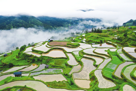 圖為5月19日拍攝的貴州省黎平縣尚重鎮(zhèn)洋洞村梯田(無人機(jī)照片)。小滿節(jié)氣前,貴州省黔東南苗族侗族自治州黎平縣尚重鎮(zhèn)洋洞村周圍的梯田蓄水豐盈,一場新雨過后,云霧繚繞,如詩如畫。