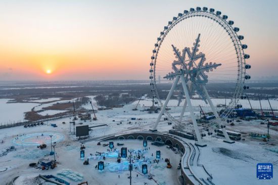 這是12月9日拍攝的哈爾濱冰雪大世界雪花摩天輪附近的施工場景(無人機照片)。